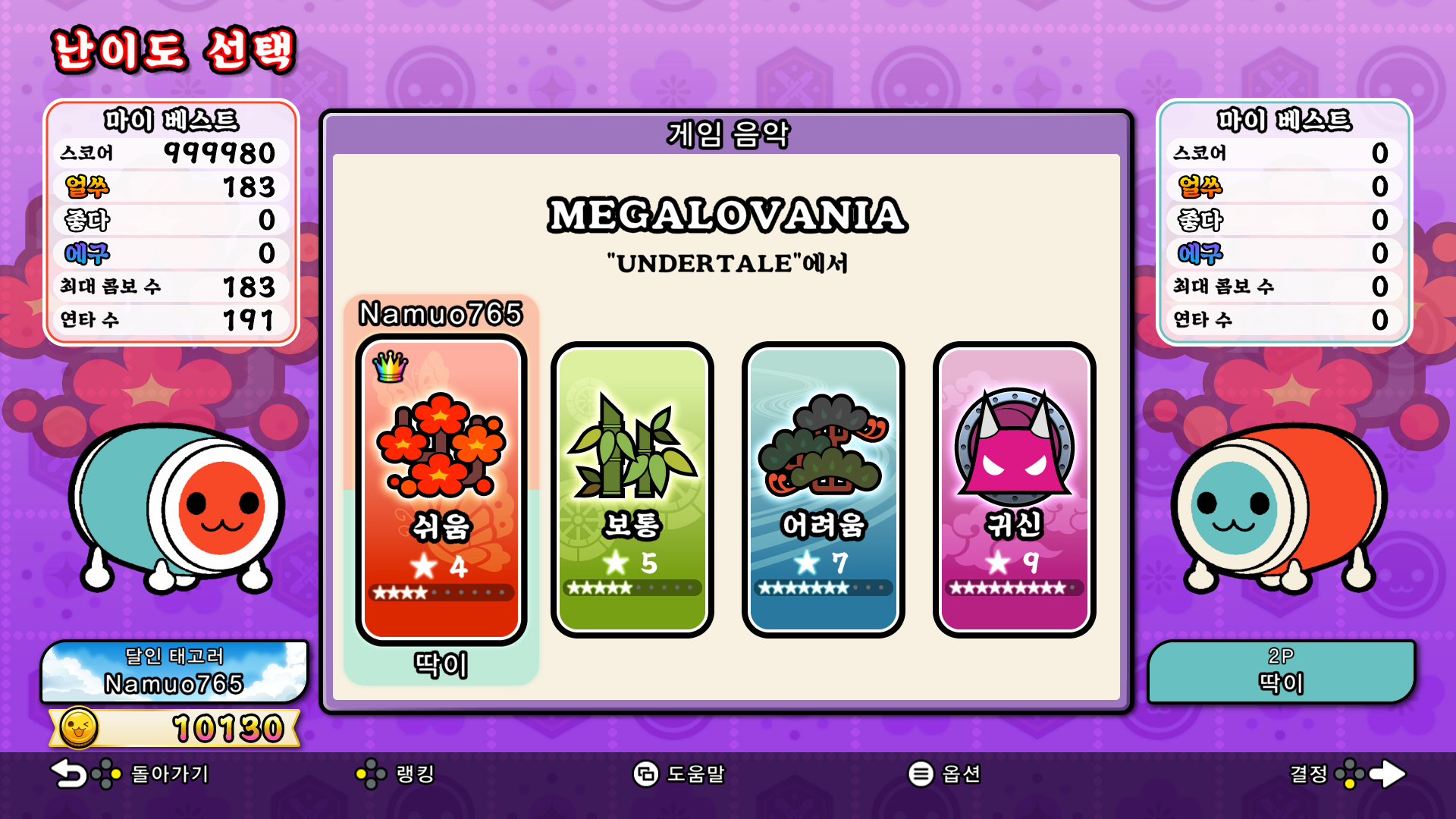 2종류의 음표 '쿵'과 '딱'을 리듬에 맞춰 두드려 고득점을 노리자! 'HOMURA', 'Into The Night', 'MEGALOVANIA' 등 인기곡부터 스탠다드한 곡까지 약 70곡의 풍부한 라인업에서 원하는 곡을 골라 즐겁게 연주를 즐길 수 있다.