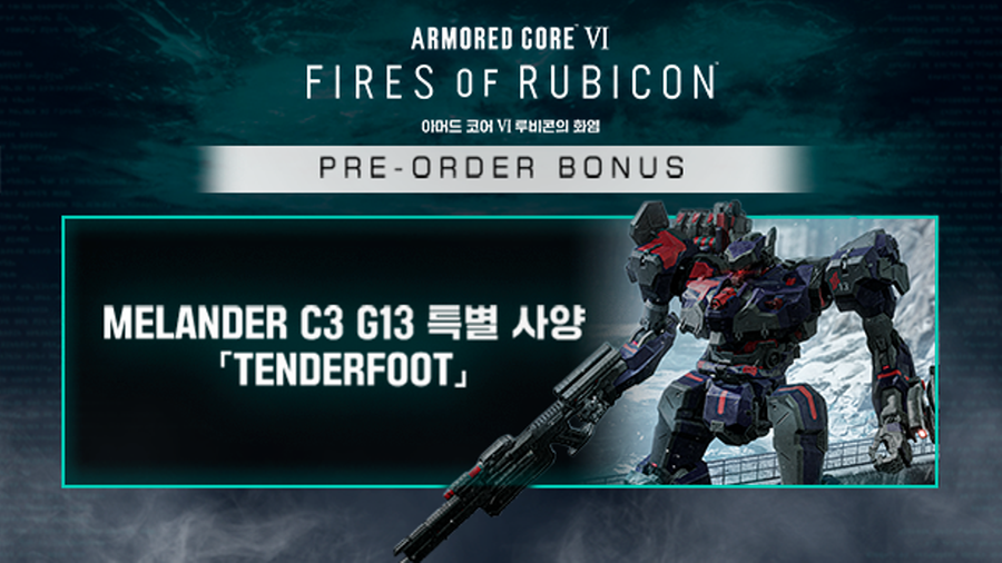 ‘ARMORED CORE VI FIRES OF RUBICON(아머드 코어 VI 루비콘의 화염)’의 패키지 초회 동봉판 특전・다운로드판 예약 특전으로 게임 내에서 사용할 수 있는 기체 파츠 및 오리지널 페인트/데칼로 구성된 기체 데이터 ‘MELANDER C3 G13 특별 사양 「TENDERFOOT」’을 증정한다.