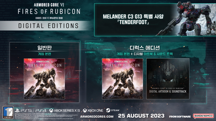 ‘ARMORED CORE VI FIRES OF RUBICON(아머드 코어 VI 루비콘의 화염)’의 PlayStation®5, PlayStation®4용 패키지 버전 일반판과 PlayStation®5, PlayStation®4, Xbox Series X|S, Xbox One, STEAM®용 다운로드 버전의 예약 판매를 진행 중이다.