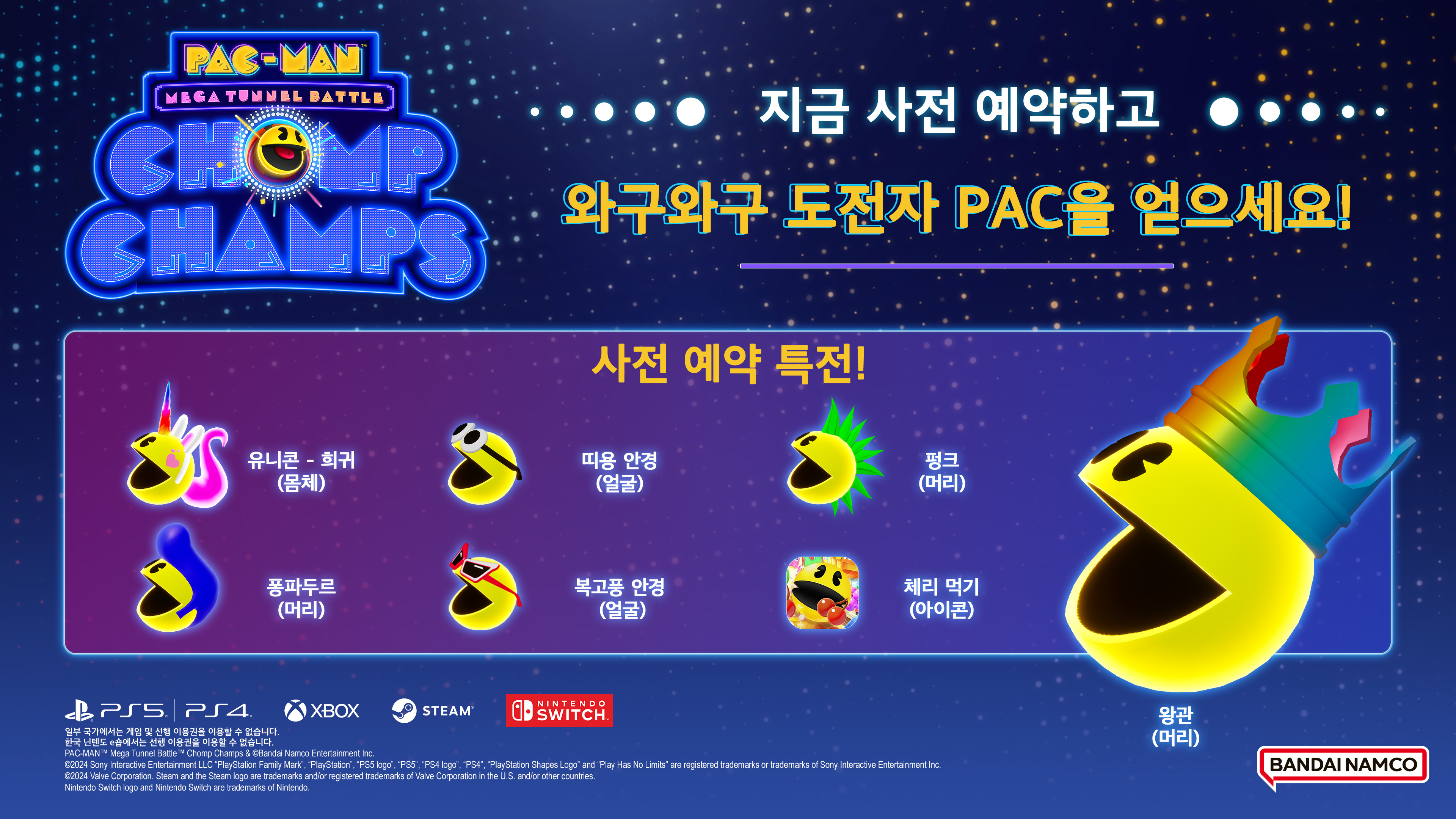 반다이남코 엔터테인먼트 코리아(지사장 장태근)는 Nintendo Switch™, PlayStation®5, PlayStation®4, Xbox Series X|S, Steam®용 다운로드 전용 ‘PAC-MAN Mega Tunnel Battle: CHOMP CHAMPS’(한국어판)을 5월 9일(목) 발매한다고 발표했다.