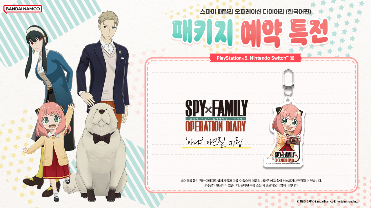 ‘스파이 패밀리 오퍼레이션 다이어리’(한국어판)의 PlayStation®5, Nintendo Switch™용 패키지 버전을 예약 구매하시는 분께 본 작품의 주인공 ‘아냐’가 인쇄된 ‘특제 아냐 아크릴 키링’을 증정한다.