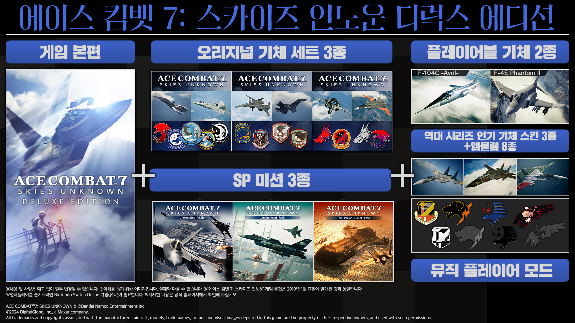 ‘에이스 컴뱃 7: 스카이즈 언노운 디럭스 에디션’에는 ‘에이스 컴뱃 7: 스카이즈 언노운’ 본편과 함께 타 기종에서 판매 중인 다운로드 콘텐츠 6종과 각종 특전이 포함된다.