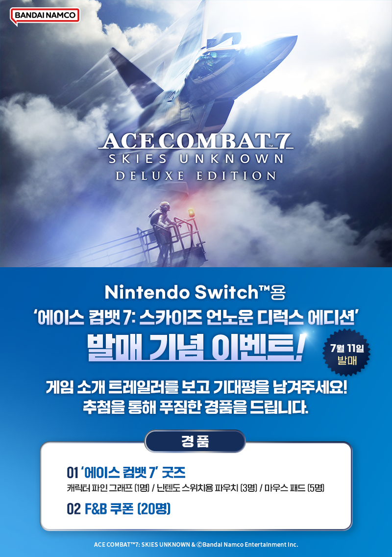 Nintendo Switch™용 '에이스 컴뱃 7: 스카이즈 언노운 디럭스 에디션'(한국어판)의 발매를 기념해, 반다이남코 엔터테인먼트 코리아의 카카오톡 페이지(https://pf.kakao.com/_Wiyxcxb#none)에서 이벤트를 진행한다.