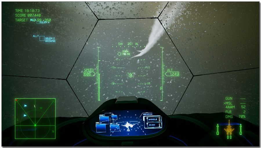 특히 구름에 돌입하거나 빗속을 비행하면 캐노피에 물방울이 고이고, 구름 등 악천후 상황에서 비행을 계속하면 기체 성능이 저하되는 결빙 현상도 발생하며, 낙뢰의 영향으로 기체 제어에 문제가 발생하는 등 환경에 영향을 받는 리얼한 공중전이 실현되어 있습니다. 따라서 적의 레이더와 적의 미사일 유도 성능의 저하를 노리고 구름 내부에 돌입하는 등 자연환경을 활용한 전술도 펼칠 수 있습니다.