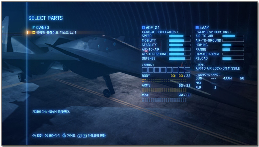 강화 파츠에는 속도나 선회 성능, 내구력 등의 기체 성능이 향상되는 BODY, 기관포나 일반무기, 특수무기 등 무장의 위력이 상승하는 ARMS, 능력 부여 등 기체 성능이 향상되는 MISC 카테고리로 나뉩니다. 각 카테고리 별로 상승하는 성능이 달라 플레이어는 선호하는 카테고리 성능을 향상시켜 나갈 수 있습니다.