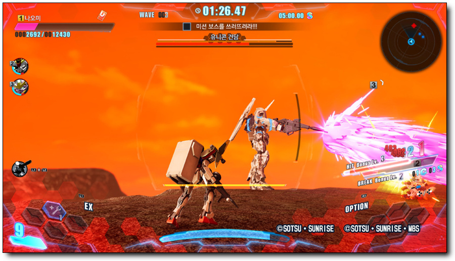[건담 브레이커4]에서는 거대 보스전이 펼쳐 지기도 합니다. 보스는 전투 중에 배리어를 전개하기도 하는데, 배리어에 대미지를 입혀 게이지가 소진되면 배리어가 사라지게 됩니다. 한편 보스는 공격으로 파괴할 수 있는 브레이크 포인트가 표시되고, 해당 브레이크 포인트를 파괴하면 효율적으로 대미지를 줄 수 있게 됩니다. 그리고 브레이크 포인트를 전부 파괴하면 일정 시간 동안 다운 상태가 됩니다.