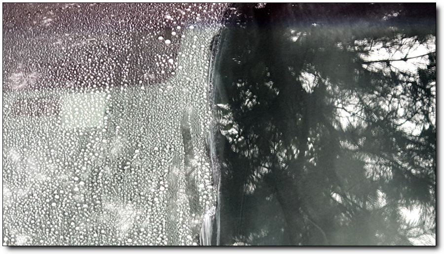 유막제거제 셀프 시공 전과 후를 비교하기 위해 차량 유리의 오른쪽에만 시공한 후에 물을 뿌려봤는데, 사진과 같이 유막이 제거된 것을 육안으로 쉽게 확인할 수 있었습니다. 연마 기계를 사용하지 않아도, 제공되는 연마패드를 손으로 가볍게 문지르는 것으로 유막을 제거할 수 있어 누구나 손쉽게 시공이 가능합니다.