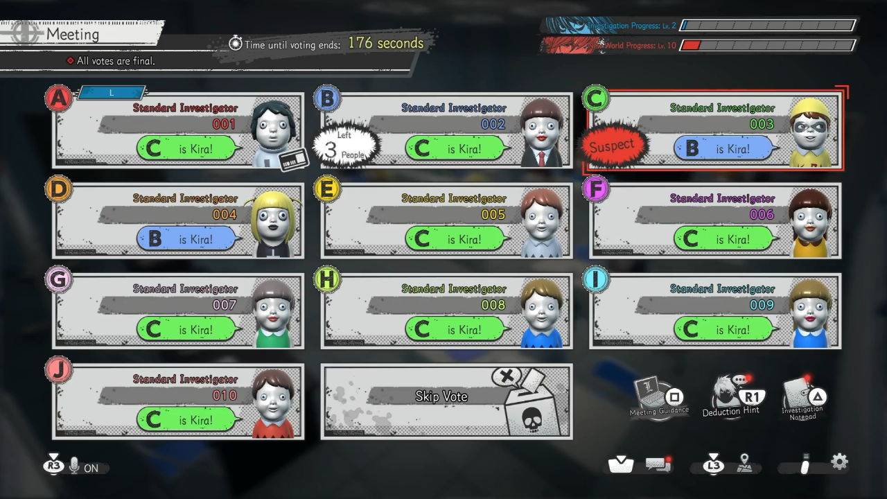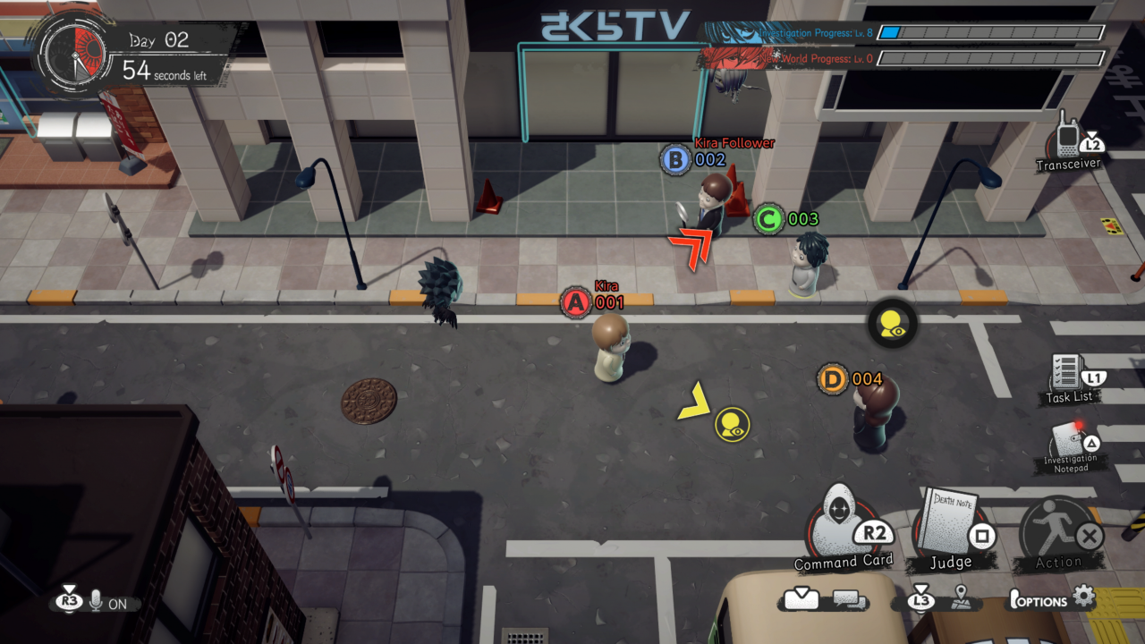 플레이어는 키라, 키라 신자, L, 조사관이라는 네 가지 역할 중 하나를 맡으며, 각 역할은 고유한 특성을 가지고 있다. 각각 역할이 할당되면, 플레이어는 무작위하게 변화하는 게임 상황에 따라 다양한 전략을 구사할 수 있다. 또한 플레이어는 네임 플레이트, 최대 7가지 액세서리를 착용할 수 있는 아바타, 게임 중 중요한 장면에서 삽입할 수 있는 보이스 포함 컷 인을 커스터마이즈 할 수 있다.