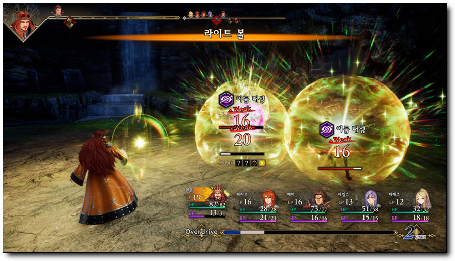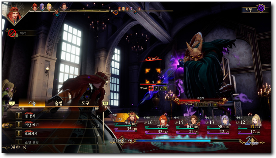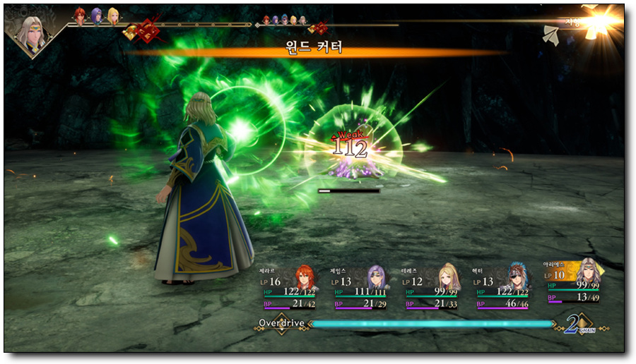 [로맨싱 사가 2 리벤지 오브 더 세븐]에서는 각 캐릭터가 순서에 따라 행동하는 타임라인 배틀 형식으로 전투가 전개됩니다. 배틀 행동 순서는 화면 왼쪽 상단에 표시되는데, 각 순서대로 기술, 술법 등을 구사해 전투에 임하게 됩니다. 게다가 방어나 카운터 등의 태세 기술은 다음 행동 순서까지 효과가 지속됩니다.