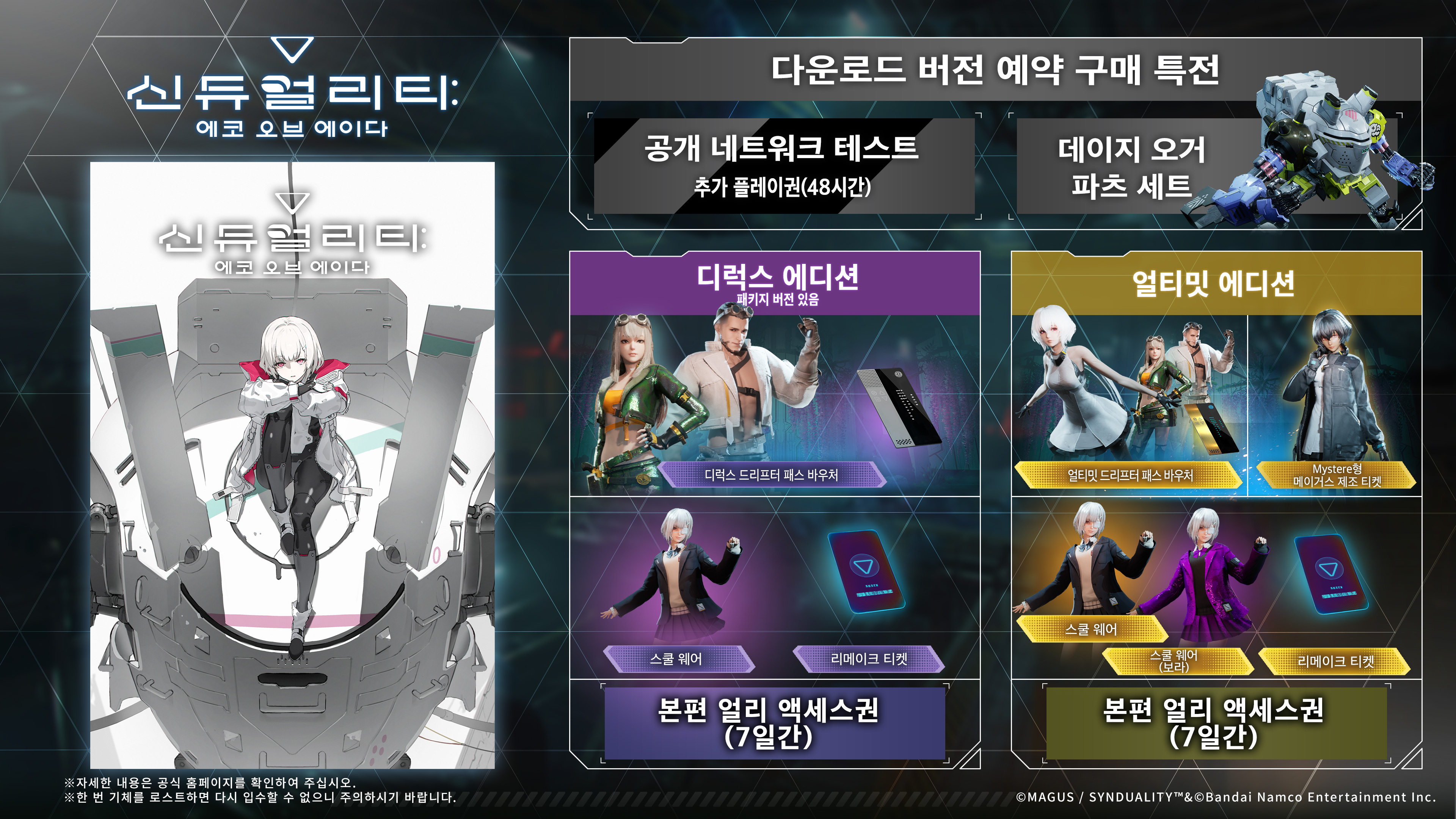 '신듀얼리티: 에코 오브 에이다'(한국어판)의 디럭스 에디션, 얼티밋 에디션을 예약 구매하면 본편을 최대 7일간 먼저 플레이할 수 있는 ‘본편 얼리 액세스권’을 입수할 수 있다.