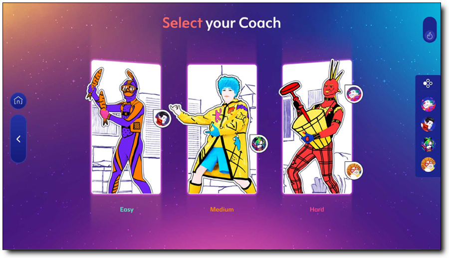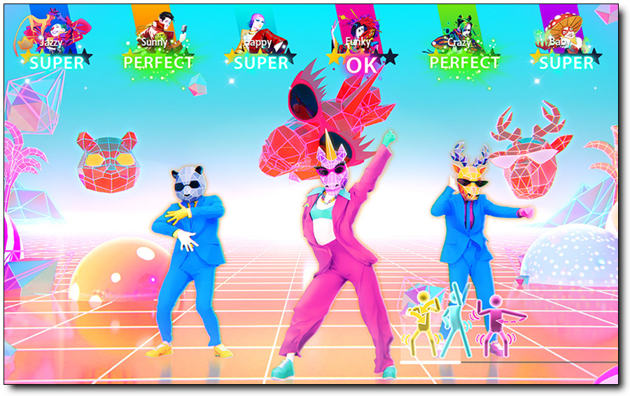 화면 우측 하단에 표시되는 픽토그램으로 다음 동작을 예측해 박자에 맞춰 화면 속의 코치와 똑같이 춤을 추면, 동작의 정확성과 리듬감을 바탕으로 평가가 이루어집니다. 점수 피드백에는 동작을 놓쳤다는 의미의 X 표시부터, OK, GOOD, SUPER, PERFECT, YEAH까지 단계별로 점수를 얻을 수 있습니다.