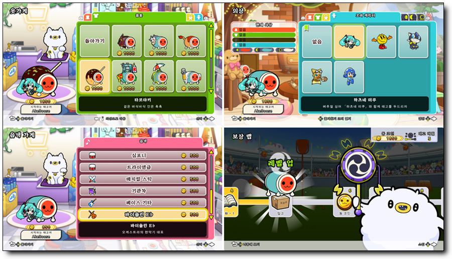 게다가 장난감 가게에서는 동이딱이 장난감 대전에서 사용할 장난감과 리더 장난감을 구입할 수 있고, 구매한 장난감은 장난감 상자 만들기에서 사용할 수 있게 됩니다. 이 외에도 탬버린, 8비트 태고, 갤러그, 스프링, 트라이앵글, 베이스 기타, 바이올린 등의 음색이나 동이의 명찰과 인사 등을 구매해 변경할 수 있습니다.