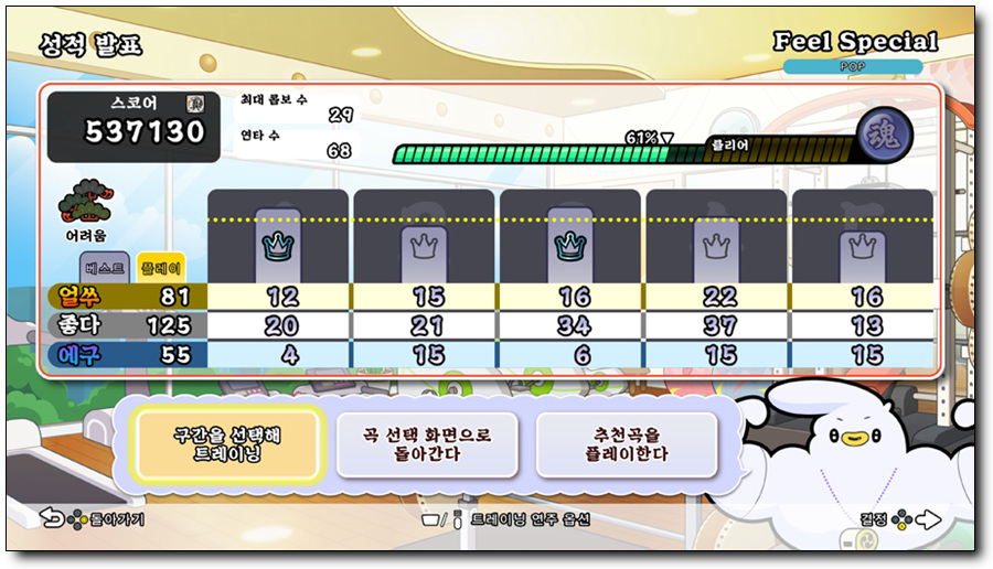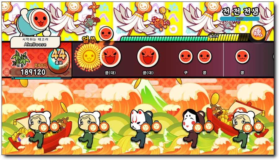 음표의 판정은 타이밍이 맞지 않은 ‘에구’부터 정확한 타이밍에 입력한 ‘얼쑤’까지 3종류로 판정이 나뉩니다. 음표를 놓치지 않고 연속으로 연주하면 스코어에 콤보 보너스가 추가되고, 혼 게이지가 상승하게 됩니다. 그리고 혼 게이지가 일정 수치인 클리어 기준을 넘어가게 되면 해당 곡을 클리어 할 수 있게 됩니다.