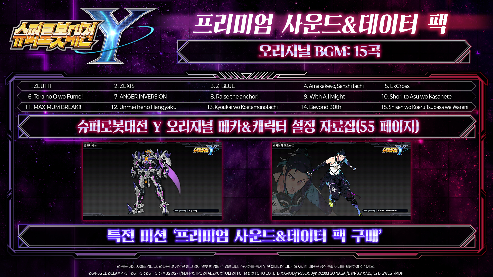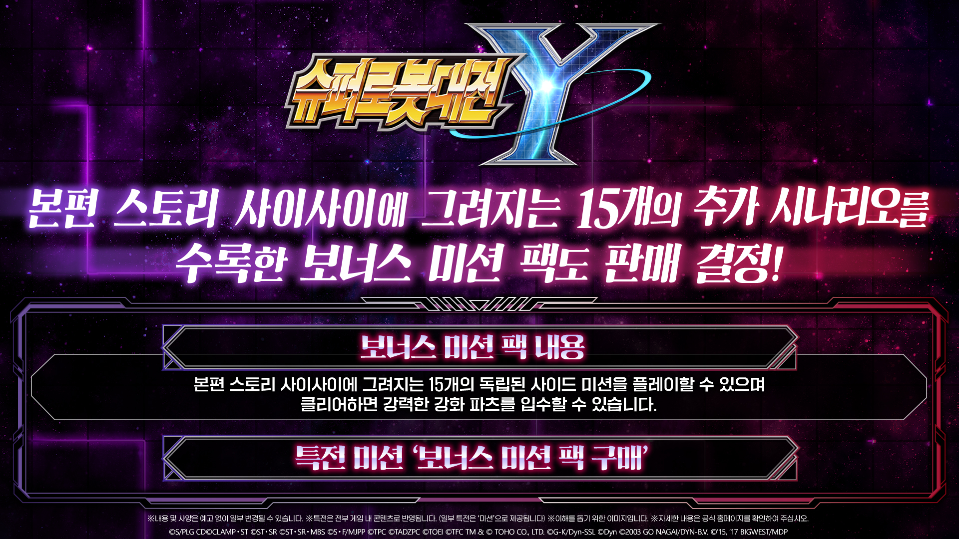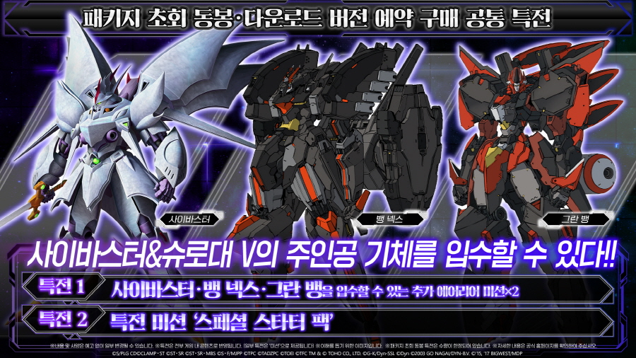 '슈퍼로봇대전 Y'(한국어판)의 패키지 초회 동봉 및 다운로드 버전 예약 구매 특전으로, '슈퍼로봇대전 OG' 시리즈 등에 등장했던 ‘사이바스터’ & '슈퍼로봇대전 V'의 주인공 기체인 '뱅 넥스', '그란 뱅'을 입수할 수 있는 추가 에어리어 미션(x2)과 자금과 강력한 아이템을 얻을 수 있는 특전 미션을 제공한다.