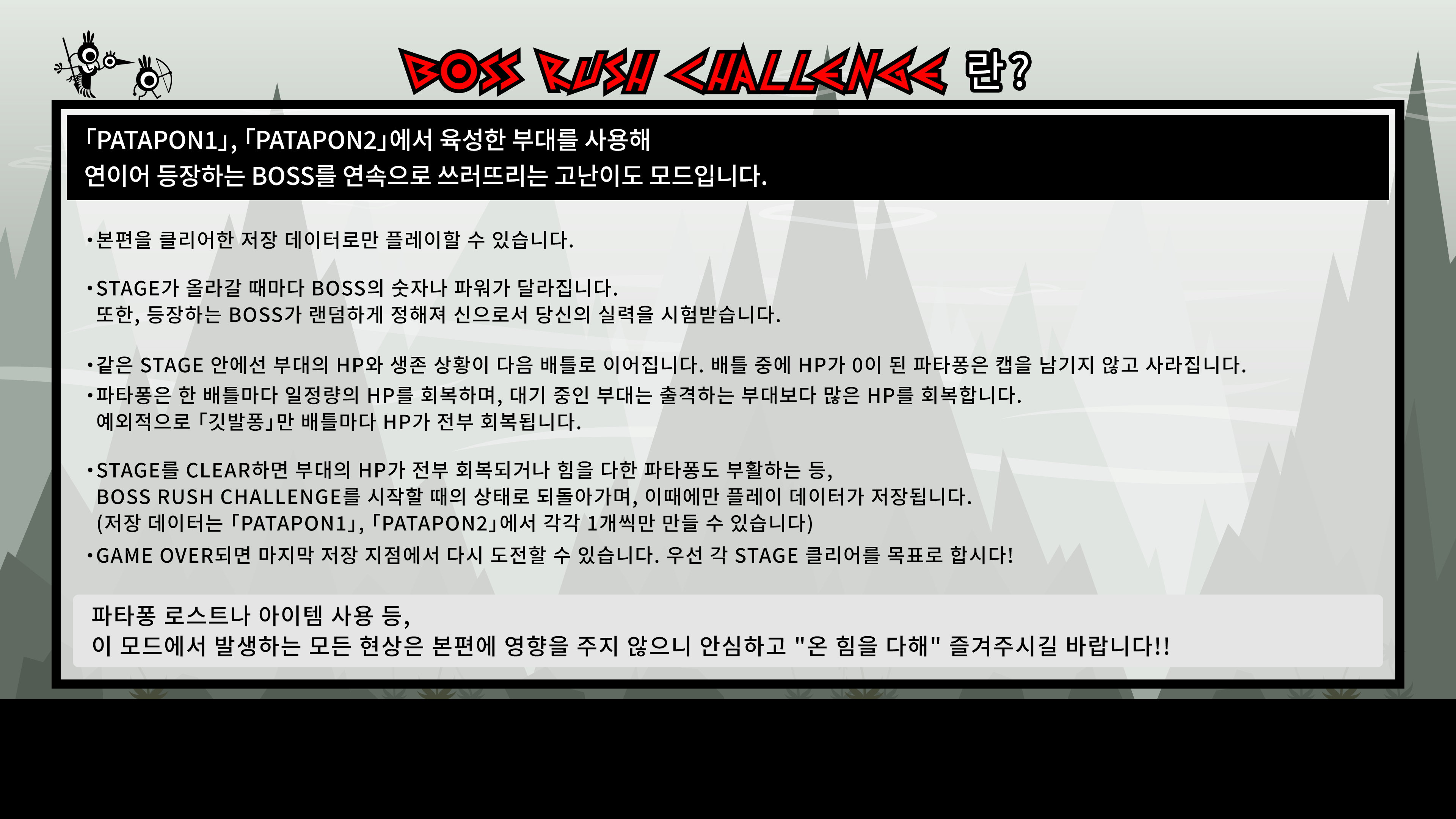 'PATAPON', 'PATAPON2'에서 육성한 부대를 사용해 연이어 등장하는 BOSS를 연속으로 쓰러뜨리는 고난이도 모드.