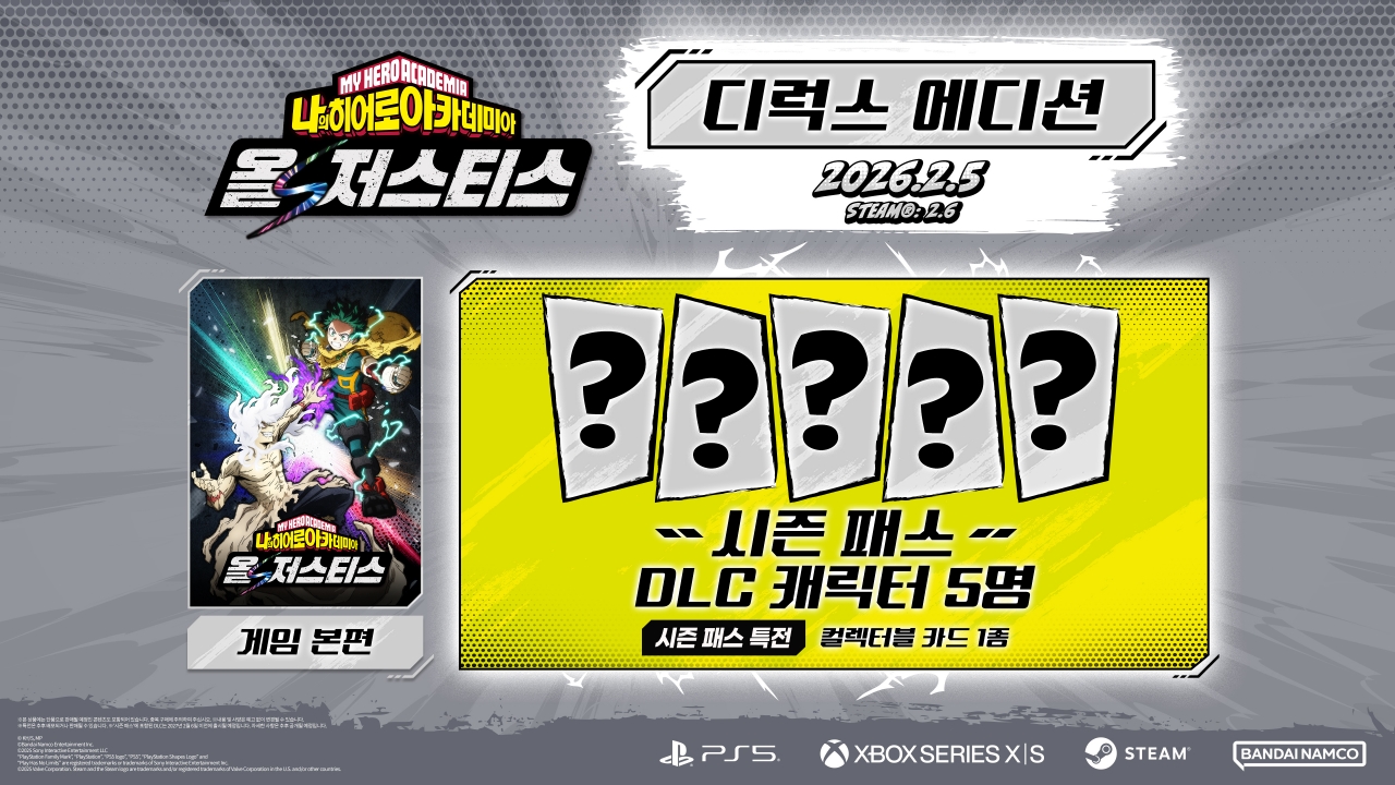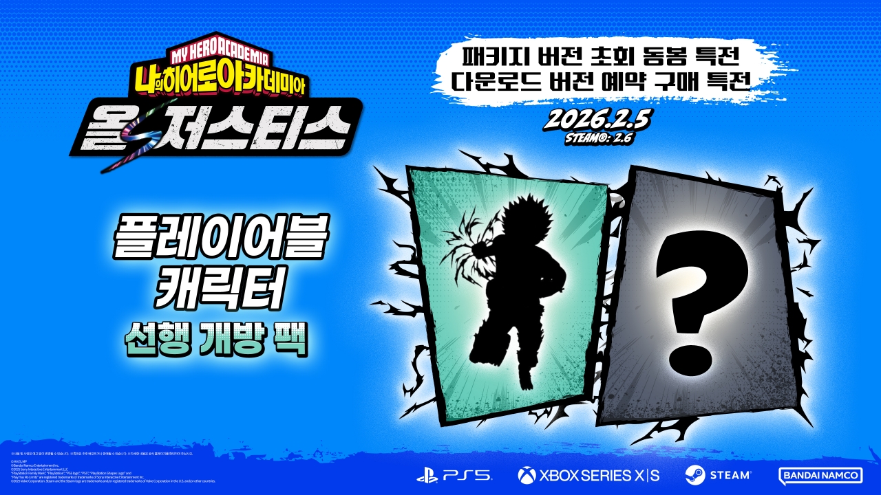 반다이남코 엔터테인먼트 코리아(지사장 장태근)는 '나의 히어로 아카데미아' 가정용 게임 최신작, PlayStation®5, Xbox Series X|S용 '나의 히어로 아카데미아 올즈 저스티스'(한국어판)를 2026년 2월 5일(목) 발매한다고 발표했다. (Steam® 버전은 2026년 2월 6일 발매)