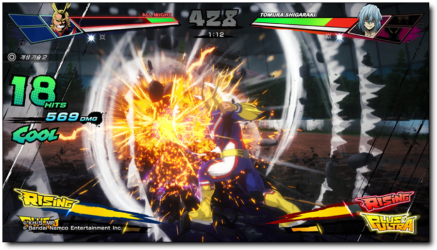 한편 플루스 울트라 게이지는 최대 3칸까지 모을 수 있는데, 플루스 울트라를 사용하면 위력이 높은 공격을 하거나 캐릭터의 특징에 따른 효과를 발동할 수 있게 됩니다. 그리고 라이징 게이지를 최대치까지 채우면 라이징을 발동해 일시적으로 캐릭터를 강화 상태로 만들 수 있습니다.