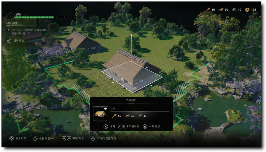 은신처에는 새로운 공간을 건설하여 개선해 나갈 수 있습니다. 건설할 수 있는 건물에는 계절별로 그 지방의 소문을 듣고 수집품 위치, 희귀한 보물 등의 정보를 알아낼 수 있는 카쿠레가, 무기와 방어구의 강화 및 분해할 수 있는 대장간, 아군이 훈련하는 장소인 도장, 비밀 정보를 수집하는 결사단의 정보실인 연구실, 정찰병을 이용해 물자 더미에 표식을 달고, 계절이 끝나면 자원을 얻을 수 있는 마구간 등이 존재합니다.