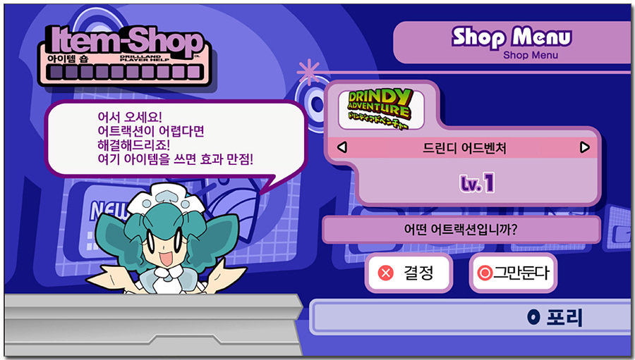 [미스터 드릴러 드릴랜드]의 아이템 숍에서는 어트랙션과 레벨에 따라 다양한 효과를 내는 아이템들을 구매할 수 있습니다. 아이템에는 배리어를 두르고 시작할 수 있는 배리어, 이동 속도가 빨라지는 스피드, 라이프 5개로 시작할 수 있는 라이프 업, 체력이 상승되는 그린 세트, 일정 체력으로 다시 부활할 수 있는 엘릭서 등이 존재합니다.