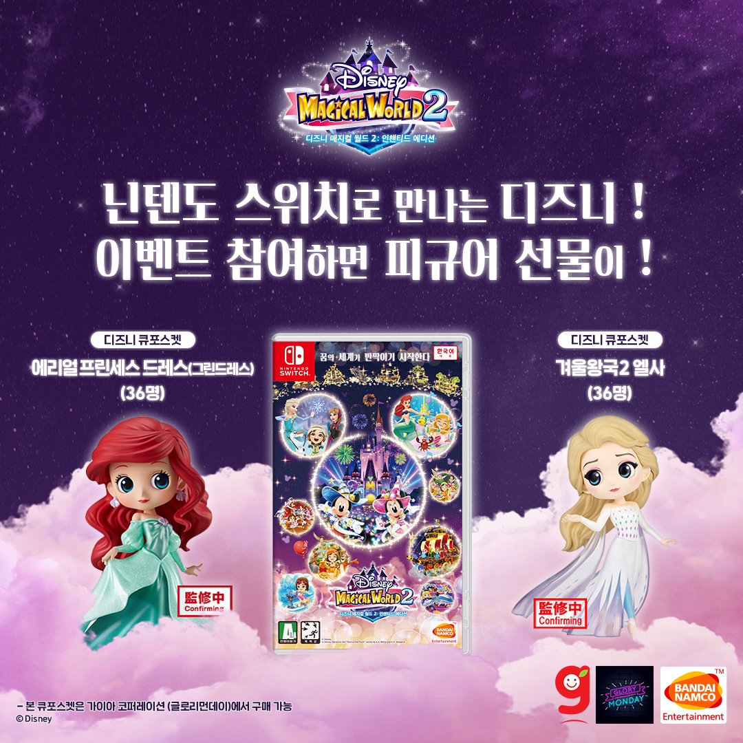 반다이남코 엔터테인먼트 코리아의 공식 카카오톡 채널에서는 ‘디즈니 매지컬 월드 2: 인챈티드 에디션’의 패키지 버전 예약 판매를 기념해 특별한 이벤트를 오픈했다. 본 작품의 한국어판 트레일러를 감상하고, 영상에서 소개된 6가지 월드 중 가장 먼저 즐겨보고 싶은 월드를 선택하여 응모에 참여하면, 추첨을 통해 ‘디즈니 큐포스켓 – 에리얼 프린세스 드레스’(36명) 또는 ‘디즈니 큐포스켓 – 겨울왕국2 엘사’(36명)를 랜덤으로 증정한다. 자세한 내용은 이벤트 페이지에서 확인할 수 있다.