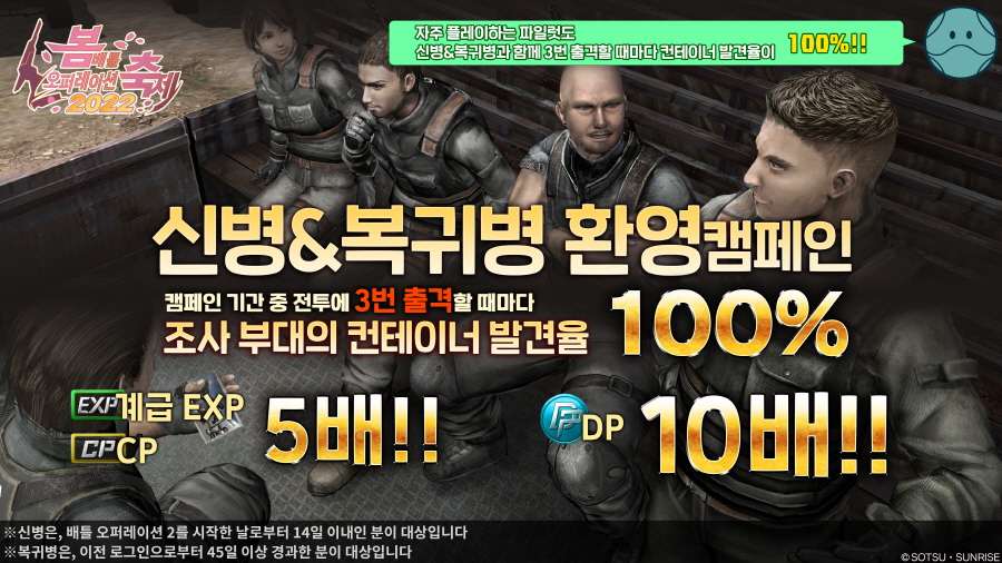 '배틀 오퍼레이션 2'를 시작한 날로부터 14일 이내인 신병&45일 이상 로그인하지 않은 복귀병 한정으로 기간 중에 전투 보수인 EXP 및 CP가 5배로, 또한 DP가 10배로 상승하는 캠페인을 개최한다. 게다가 전투에 3번 출격할 때마다 조사 부대의 컨테이너 발견율이 100%로 상승하며, 기존 파일럿도 신병&복귀병과 함께 전투에 3번 출격할 때마다 조사 부대의 컨테이너 발견율이 100%로 상승한다.