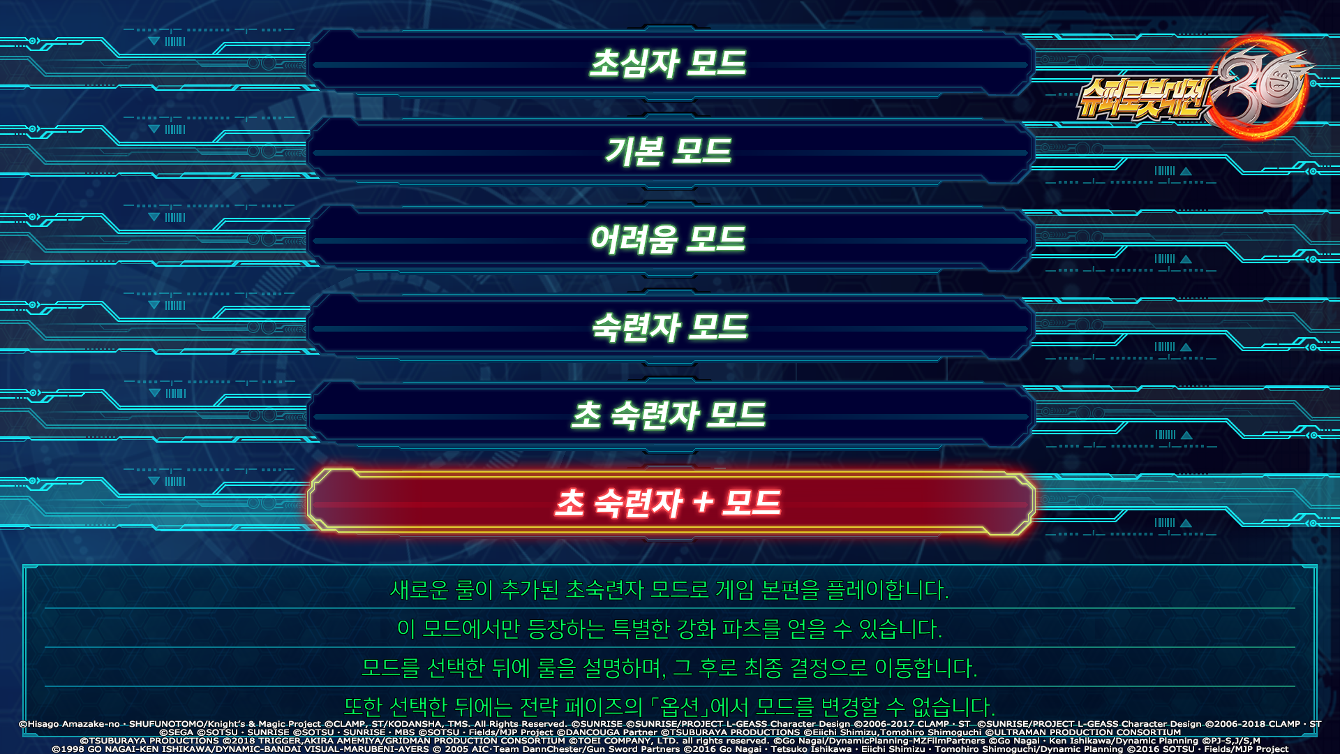 ‘슈퍼로봇대전 30’를 더욱 깊이 있게 즐길 수 있도록 각종 규칙을 변경한 최고난도 모드다. 적군의 강함 정도는 초숙련자와 동일하며, 아군 부대는 레벨 업 필요 경험치와 기체 개조 비용이 대폭 상승하고 반복 미션이 봉인되는 등과 같이 육성이 제한된다. 이 모드를 플레이하는 과정에서 초강력한 신규 강화 파츠 10개를 획득할 수 있으며, 클리어 후에는 다른 모드로 계승할 수도 있다.