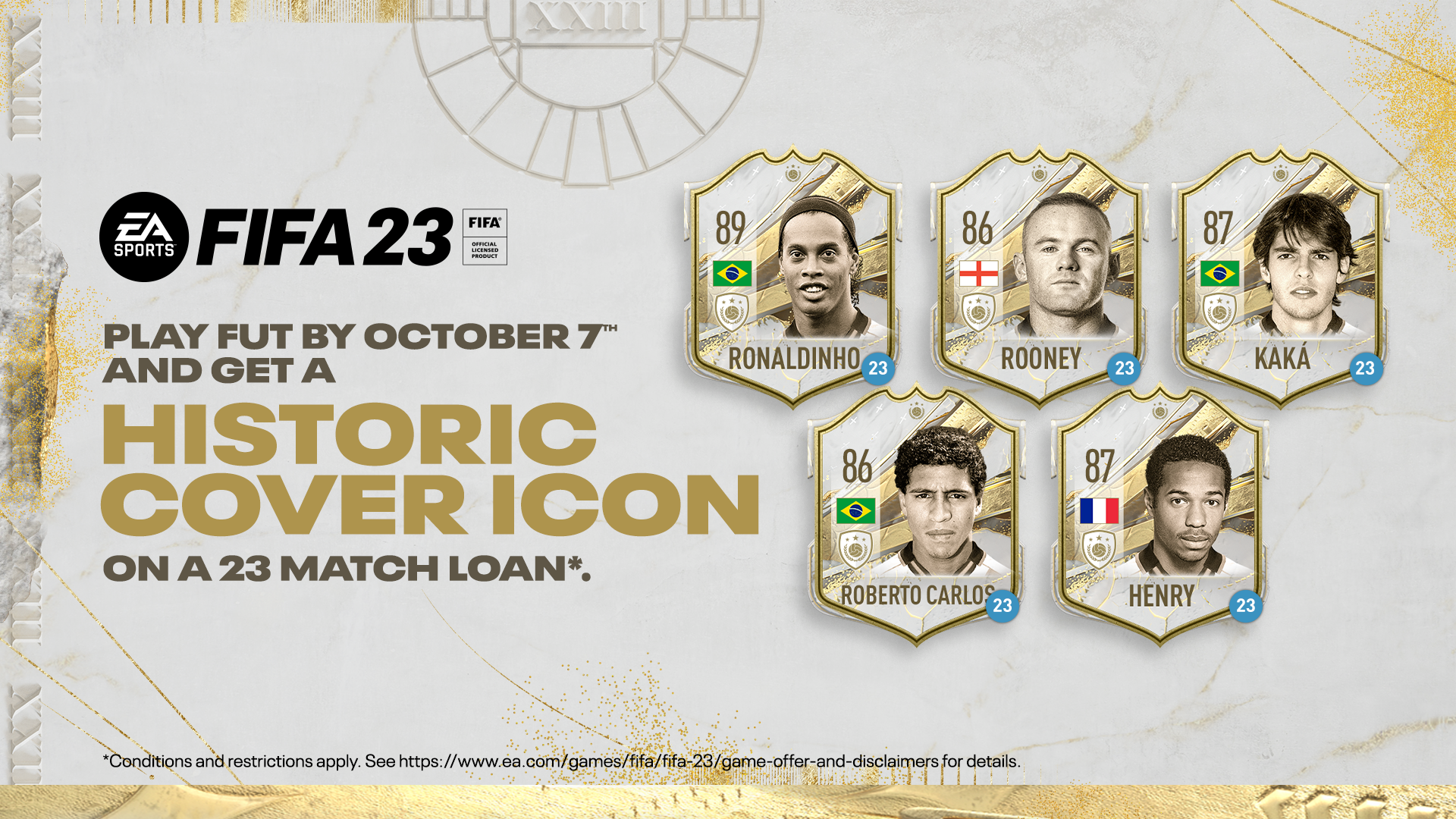 또한 10월 7일 이전까지 PlayStation5, PlayStation4, Xbox Series X|S, PC를 통해 게임 내 FIFA Ultimate Team 모드에 접속한 경우, FIFA Ultimate Team 모드에서 사용가능한 거래불가 Historic Cover ICON 임대 아이템을 수령할 수 있다. (*FUT 매치 23회 사용가능) 해당 아이템을 수령하기 위해서는 EA Account을 보유해야 하며 플레이하는 기기에 게임 최신 업데이트를 설치한 뒤 온라인 상태에서 FIFA Ultimate Team에 2022년 10월 7일 11:59 PM PST까지 접속해야 한다. (**조건과 제한사항이 적용됩니다. 자세한 내용은 https://www.ea.com/ko-kr/games/fifa/fifa-23/game-offer-and-disclaimers를 참조하세요.)