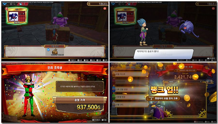 가입 조건으로 몬스터가 원하는 소재나 요리 등을 건네면, 해당 몬스터를 팀원으로 영입할 수 있게 됩니다. 게다가 보물을 모으거나 가치를 높여 트레저 총액을 목표치까지 달성하면 크루 랭크를 상승시킬 수도 있습니다. 크루 랭크가 상승하면 장비할 수 있는 코인 수가 늘어나고, 보물 감정액에 보너스가 붙는 등 보다 더 편하게 모험을 즐길 수 있게 됩니다.