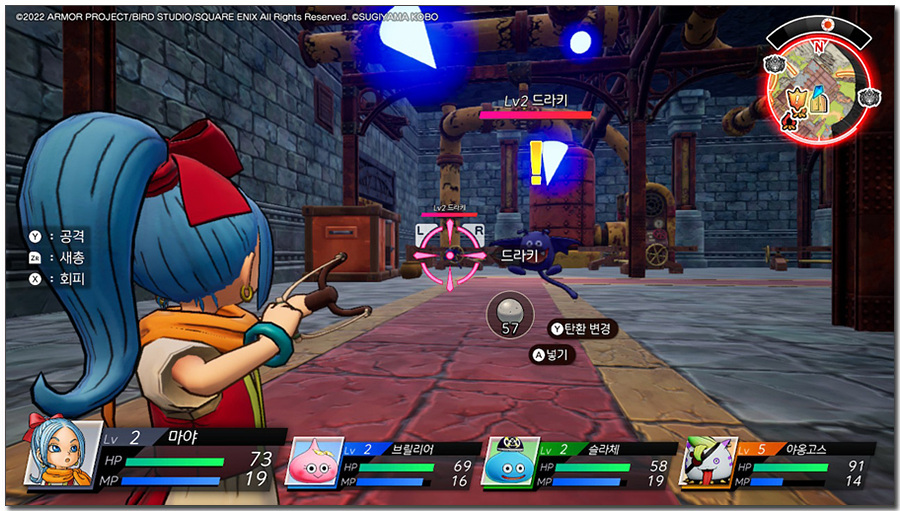 [드래곤 퀘스트 트레저즈 푸른 눈동자와 하늘의 나침반]의 필드에서는 몬스터와 배틀이 펼쳐집니다. 배틀에서는 공격과 회피 조작이 가능하고, 동료가 된 몬스터는 전투가 시작되면 알아서 적과 전투를 펼칩니다.