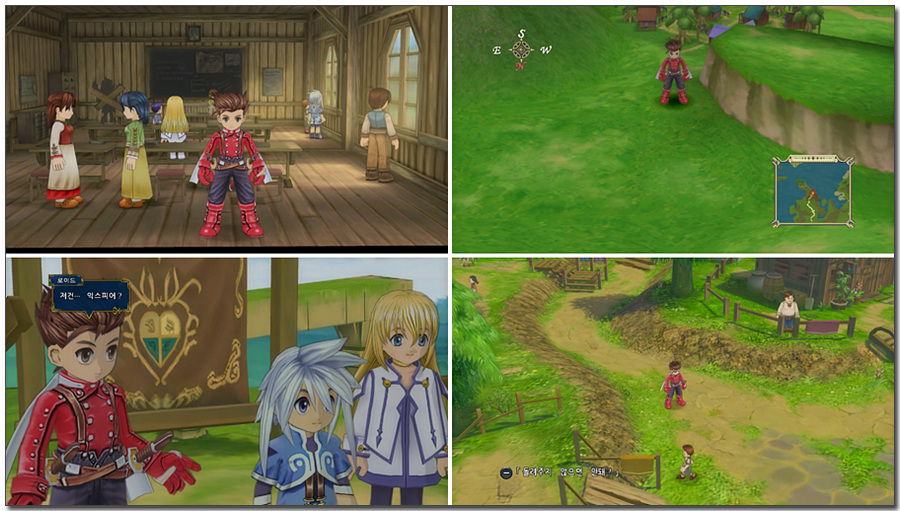 [테일즈 오브 심포니아 리마스터]는 기본적으로 던전에서 탐색을 수행하는 일반맵과 마을 사이를 이동하거나 목적지를 탐색하는 필드맵으로 나뉘어 진행됩니다. 마을과 던전에 입장하면 일반맵 화면이 전개되는데, 마을 사람들과의 대화를 통해 퀘스트를 의뢰받거나 던전을 탐험해 정보를 수집하게 됩니다.