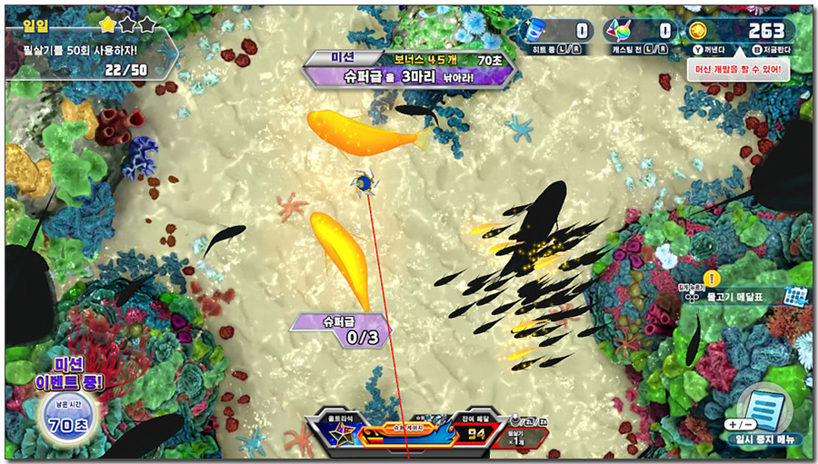 그래도 물고기가 도망가려는 타이밍에 필살기로 전기 충격을 가해 물고기를 낚아 올리고, 조이콘의 자이로 센서와 진동 기능을 활용해 직관적인 조작으로 낚시의 묘미를 구현해 내고 있는 작품입니다.