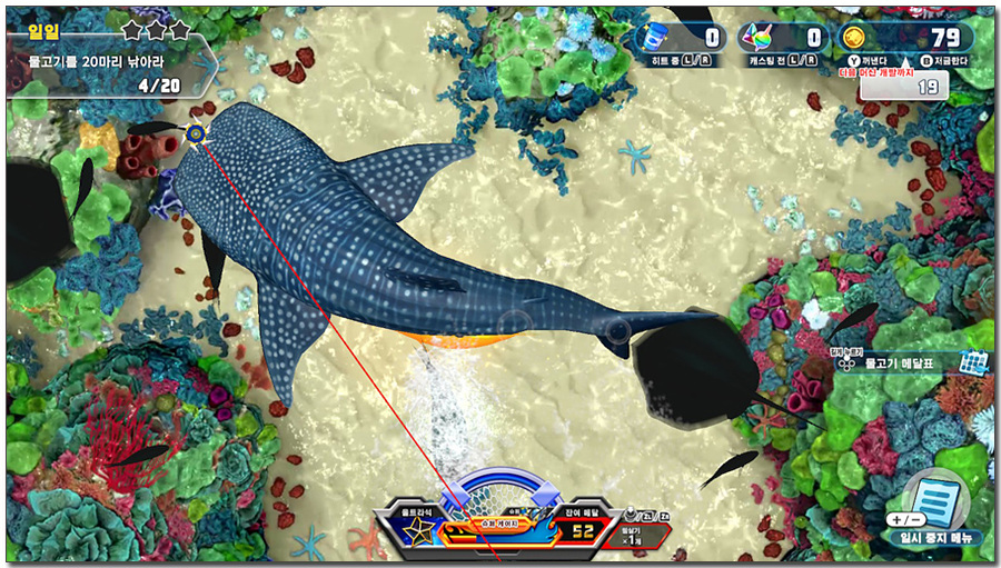 낚싯대를 구입하여 장비하면 특정 물고기 소환 먹이로 낚싯대의 물고기를 소환할 수 있게 됩니다. 물고기 소환 먹이는 일일 미션을 클리어하면 획득할 수도 있는데, 낚싯대 종류에 상관없이 해당 물고기를 소환할 수 있습니다. 게다가 무지개색 낚시찌를 사용하면 무지개색 물고기가 반드시 히트하게 되고, 성공적으로 낚아 올리면 보물을 획득할 수 있습니다.