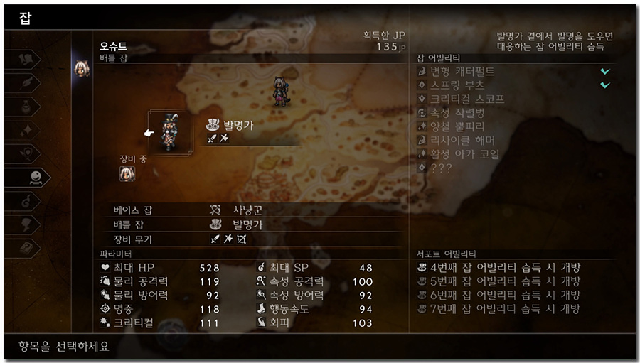 전투에서 JP를 획득하면 어빌리티에서 원하는 순서대로 잡 어빌리티를 습득해 캐릭터를 강화시켜 나갈 수 있습니다. 게다가 잡 어빌리티를 일정 수 습득하면 장비하기만 해도 항상 효과를 발휘하는 서포트 어빌리티도 습득할 수 있습니다. 서포트 어빌리티는 최대 4개까지만 장비할 수 있습니다.