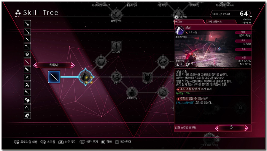 일부 소드 스킬은 자세를 잡고 좌우로 스텝 이동을 할 수 있습니다. 소드 스킬은 특수효과를 가지고 있어 적의 행동에 따라 효과를 줄 확률이 달라져 자세를 잡으면서 확률이 높은 타이밍에 스킬을 발동해야 하고, 적을 겨냥하는 조준 소드 스킬은 힘을 모아 위력을 높일 수 있어 적의 약점 부위를 노릴 때 유용하게 활용할 수 있습니다.