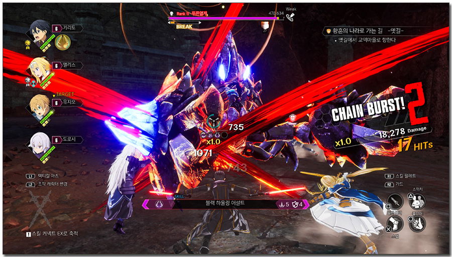 [소드 아트 온라인 라스트 리콜렉션]에서 배틀이 전개되면 일반 공격 버튼을 연타하여 연속 공격이 가능하고, 최대 3개의 소드 스킬로 파생됩니다. 공격을 명중시키면 적의 체력 게이지 아래의 BREAK 게이지가 누적됩니다. 해당 게이지가 최대치에 도달하면 적을 브레이크 상태에 빠뜨릴 수 있게 됩니다.