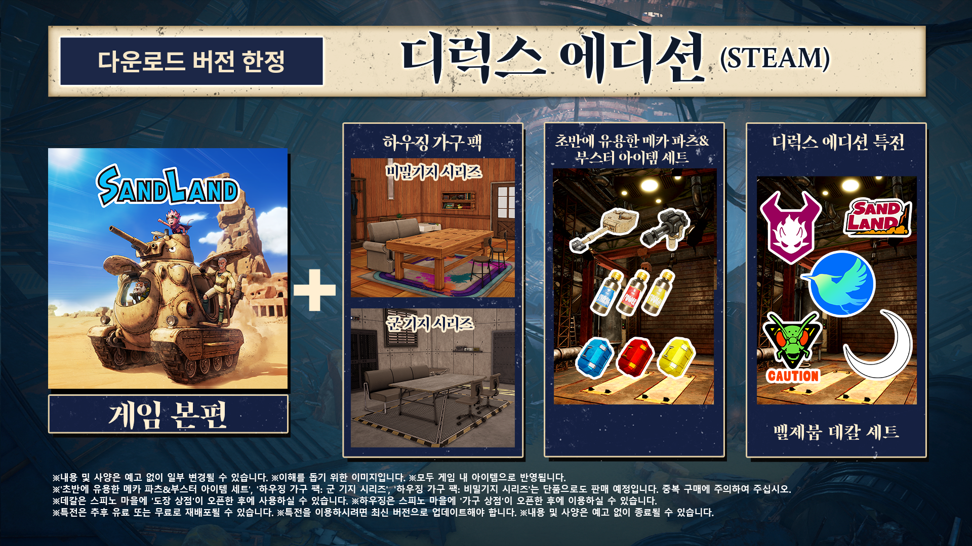 ‘SAND LAND’(한국어판)의 패키지 버전 초회 동봉 특전 및 다운로드 버전 예약 구매 특전으로 ‘메카 커스터마이즈 컬러링 3종’을 제공한다. 게임에 등장하는 메카를 컬러링하여 나만의 메카를 만들 수 있다.