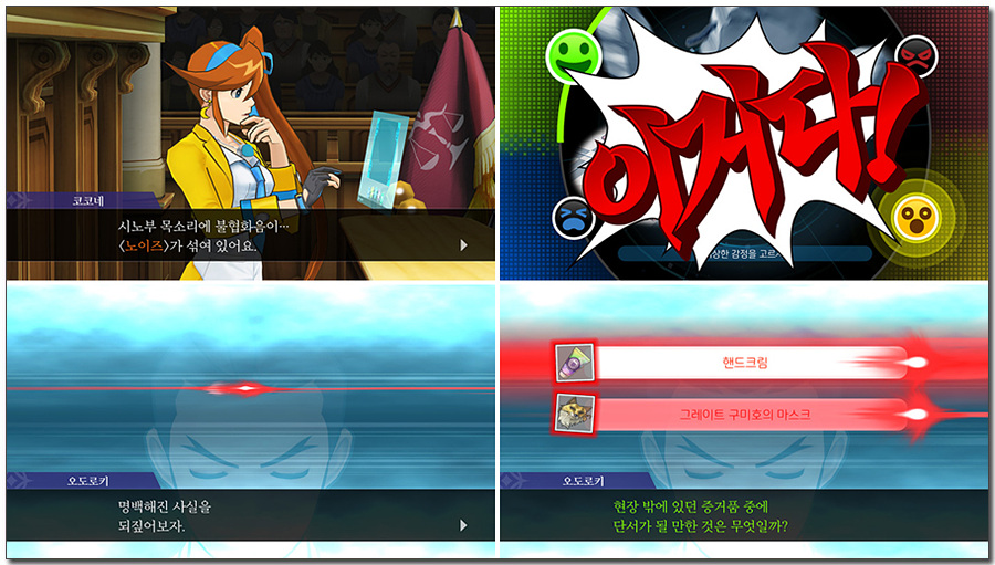 심리스코프에서 노이즈를 감지했을 때는 증언과 감정 간에 모순이 발생하게 되고, 증언 내용과 증언자의 감정을 비교하여 증언과 모순되는 감정을 지적할 수 있게 됩니다. 그리고 법정에서 밝혀진 사실을 돌아보며 특정 루트를 선택해 결정적인 단서를 찾을 수도 있습니다.