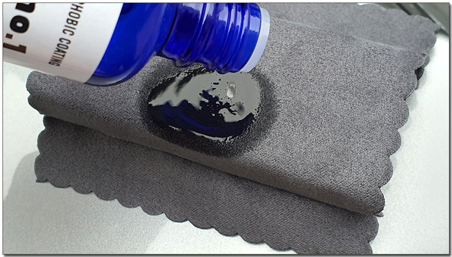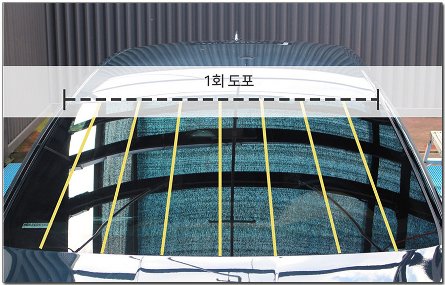 차량 앞 유리 기준 도포는 8칸으로 나눠 도포하고, 코팅제가 남은 경우 여러 번 반복해서 보강 도포 작업을 해줍니다. 그리고 15분 건조 뒤 타월로 코팅제를 닦아주면 됩니다.