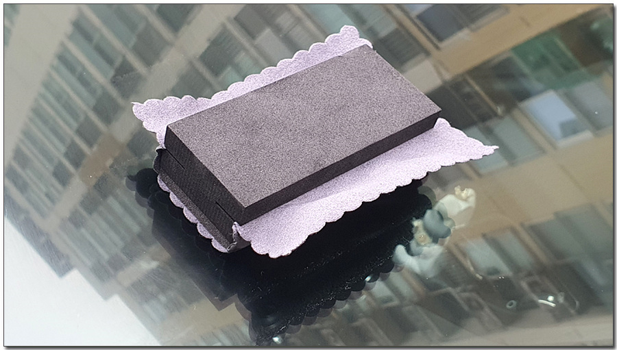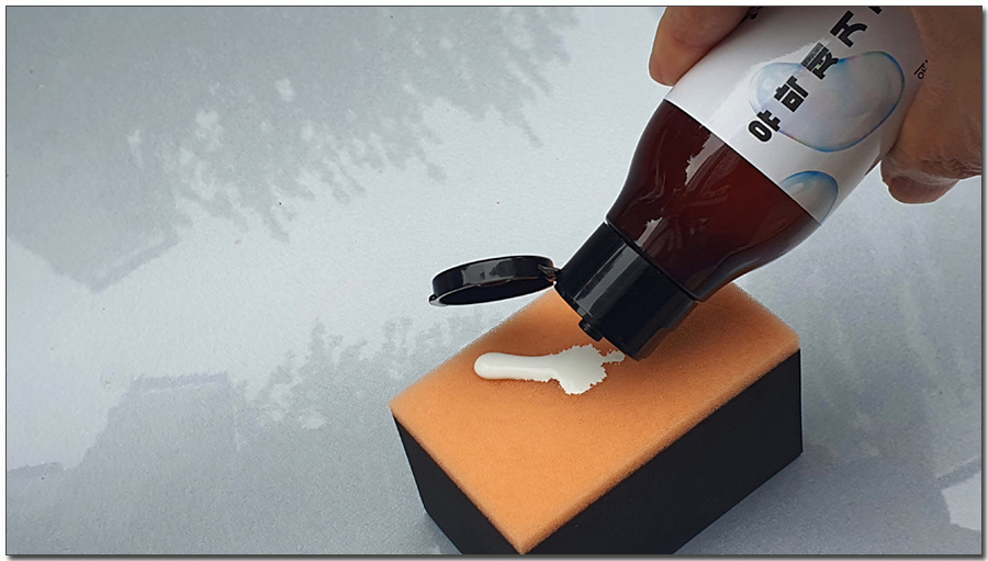 유막제거제 싹을 충분히 흔들어 준 다음에 전용 연마패드에 유막제거제 원액을 바르고, 시공하고자 하는 유리면에 도포해 줍니다. 유막제거제가 마르면 연마패드에 물을 조금 묻혀서 문질러 줍니다.
