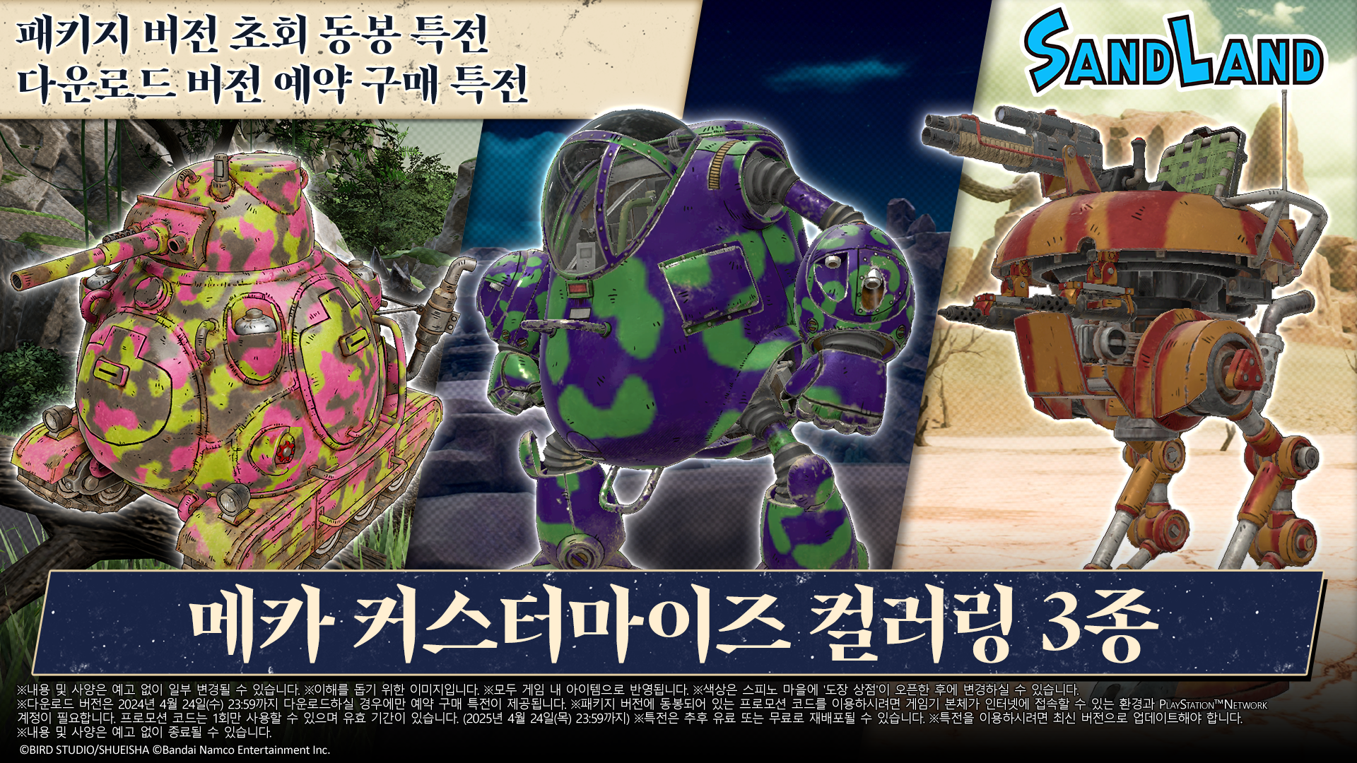 ‘SAND LAND’(한국어판)의 PlayStation®5용 패키지 버전 초회 동봉 특전 및 다운로드 버전 예약 구매 특전으로 ‘메카 커스터마이즈 컬러링 3종’을 제공한다. 게임에 등장하는 메카를 컬러링하여 나만의 메카를 만들 수 있다.