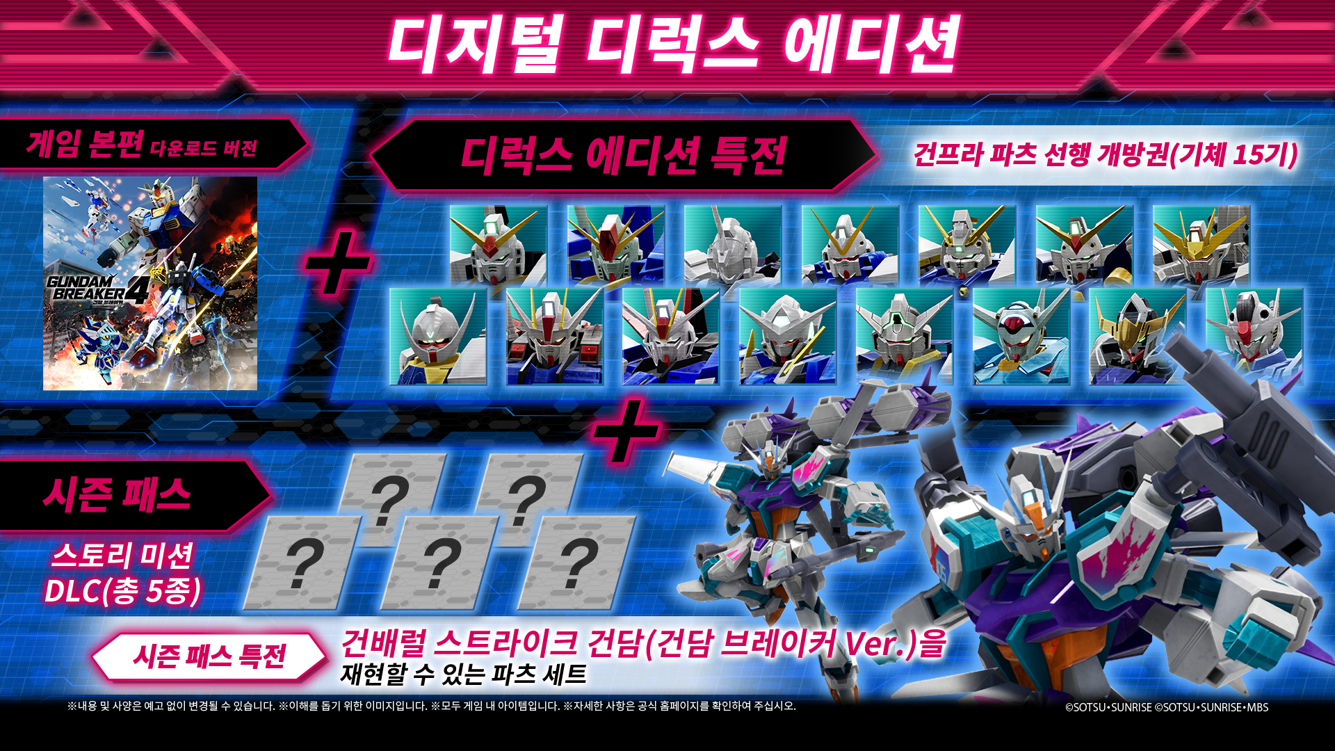‘건담 브레이커 4’(한국어판) PlayStation®5, PlayStation®4, STEAM®용 다운로드 버전의 예약 판매를 진행 중이다. 일반판을 비롯해 시즌 패스가 세트로 구성된 '디지털 디럭스 에디션'과 시즌 패스와 디오라마 팩이 세트로 구성된 '디지털 얼티밋 에디션'을 판매한다.