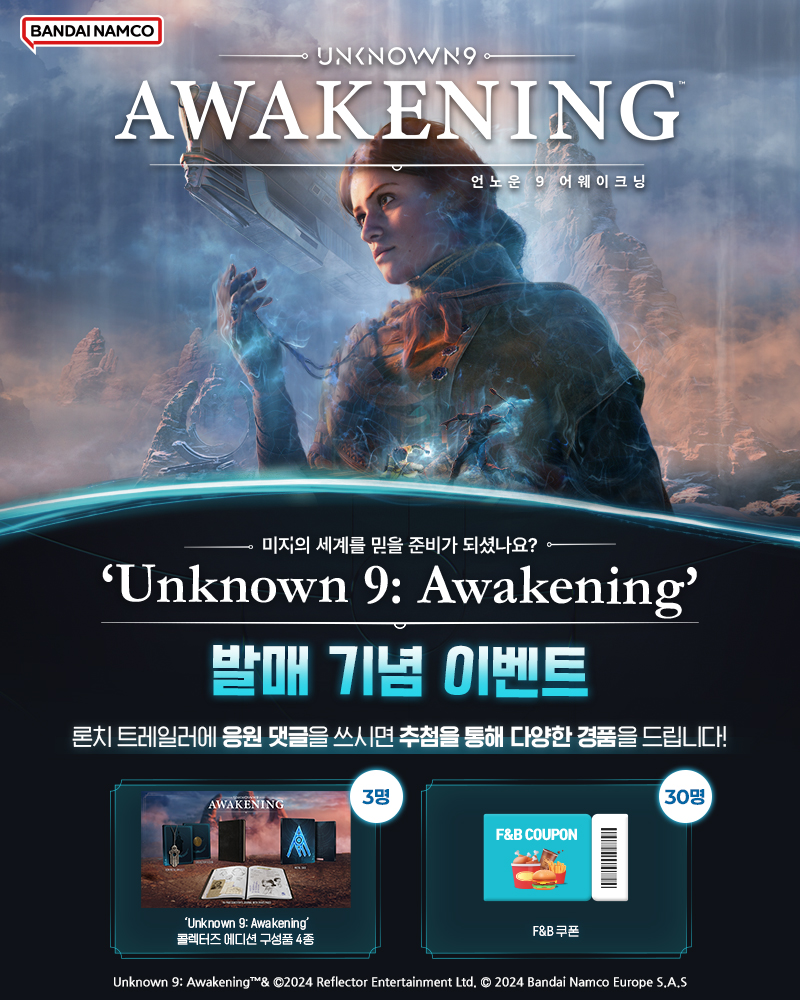 ‘Unknown 9: Awakening’의 트레일러를 보고 응원 댓글을 남기면, 추첨을 통해 ‘Unknown 9: Awakening’ 콜렉터즈 에디션 구성품 4종(3명), 식음료 쿠폰(30명)을 증정한다. 해당 이벤트는 10월 31일(목)까지 진행된다.
