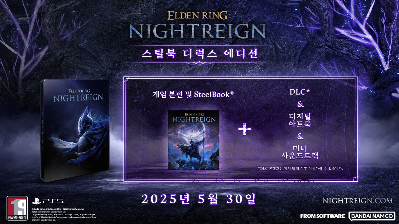 PlayStation®5용 패키지 버전 ‘ELDEN RING 밤의 통치자’의 다양한 에디션이 공개되었다. 일반판 외에도 ‘스틸북 디럭스 에디션’, ‘콜렉터즈 에디션’을 만나볼 수 있다.