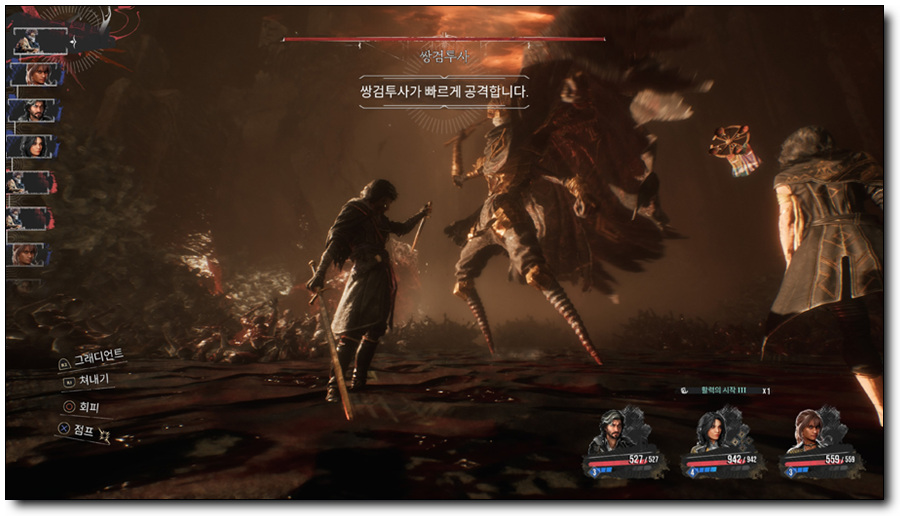 적이 공격할 때 적절한 타이밍에 회피하면 피해를 받지 않게 되고, 마지막 순간에 회피하면 완벽 회피가 발동하게 됩니다. 그리고 적 공격 도중에 공격을 쳐낼 수도 있습니다. 쳐내기는 완벽 회피와 동일한 타이밍에 이루어지다 보니 일반 회피보다 타이밍을 맞추기가 어렵지만, 쳐내기에 성공하면 피해를 받지 않고 AP도 회복할 수 있게 됩니다.