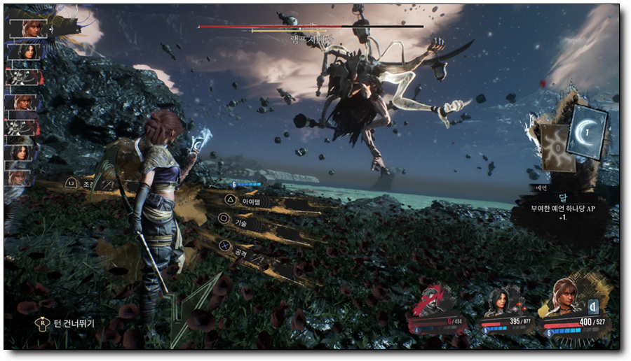 [클레르 옵스퀴르 33 원정대]는 턴제를 기반으로 턴에 따라 순차적으로 행동하게 되는데, 턴 순서는 왼쪽 타임라인에 표시됩니다. 플레이어는 캐릭터의 공격, 조준, 기술, 아이템 등을 턴에 사용할 수 있는데, 이 중에 기술은 AP를 소모합니다. 소모된 AP는 기본 공격이나 쳐내기로 얻을 수 있습니다.