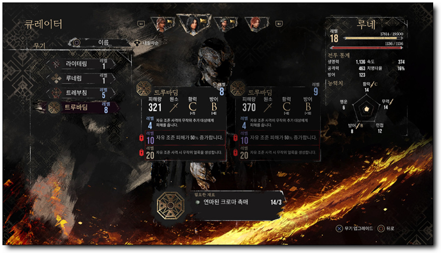 큐레이터를 통해 크로마 촉매를 사용해서 무기를 업그레이드할 수 있습니다. 무기의 지속 효과는 해당 무기를 장착해야만 활성화되는데, 업그레이드를 통해 공격력이 증가하고, 능력치가 상승하며, 희귀도에 따라 지속 효과가 해제되기도 하는 등 캐릭터의 능력치에 기반하여 주는 피해가 증가합니다. 공격력 변화는 관련 문자로 표시되며, D부터 S 등급까지 존재합니다.